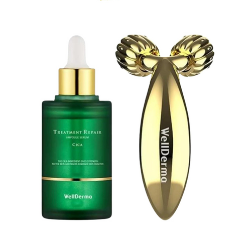 Bộ sản phẩm Wellderma Treatment Repair Ampoule Serum Cica gồm: Serum Cica và thanh lăn Roller