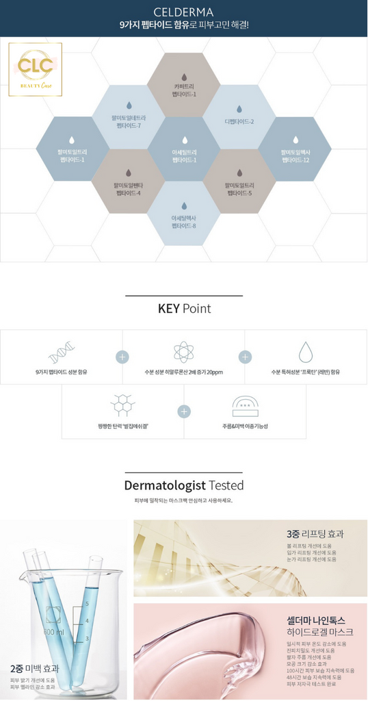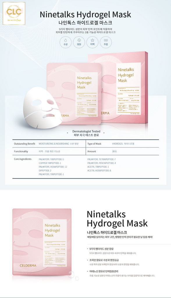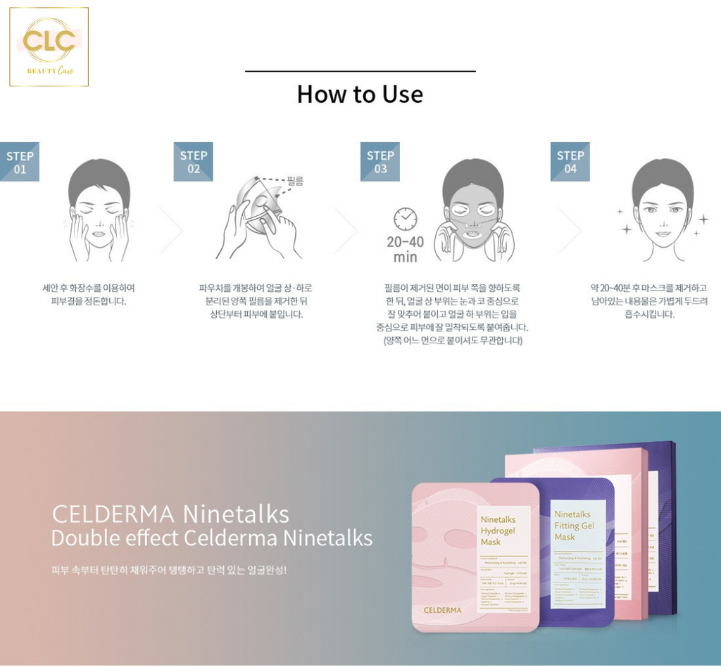 Mặt nạ Celderma Ninetalks Hydrogel Mask từ Hàn Quốc giúp cấp ẩm và cải thiện độ đàn hồi của da với 9 loại Peptide và thành phần Fructant được cấp bằng sáng chế giúp bổ sung độ ẩm cà cải thiện độ đàn hồi cho da.