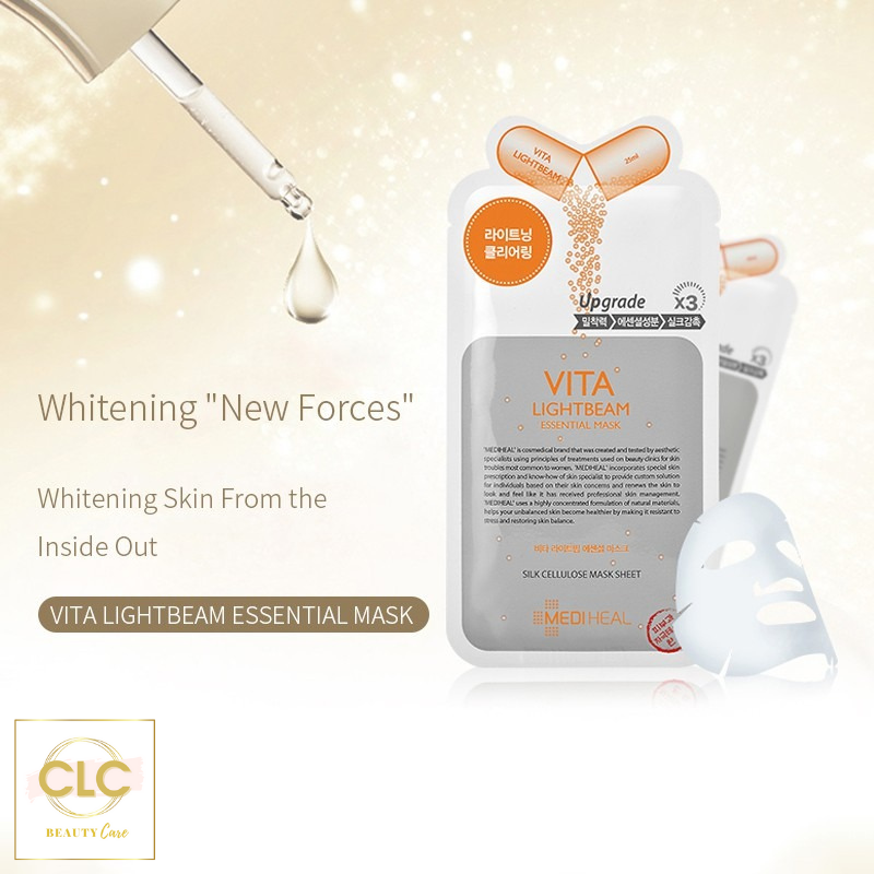 Mặt Nạ Dưỡng Sáng Da Vita Lightbeam Essential Mask Mediheal chứa vitamin C, Oryzanol, Tocopheryl Acetate, chiết xuất rễ cây dâu tằm, Arbutin (tinh chất làm trắng) có tác dụng giúp ngăn chặn sự phát triển của các sắc tố melanin làm đen da đồng thời cải thiện được vết thâm và tàn nhang. Tăng cường sức đề kháng và cung cấp độ ẩm, mang lại vẻ tươi trẻ, tránh tình trạng lão hóa da.
