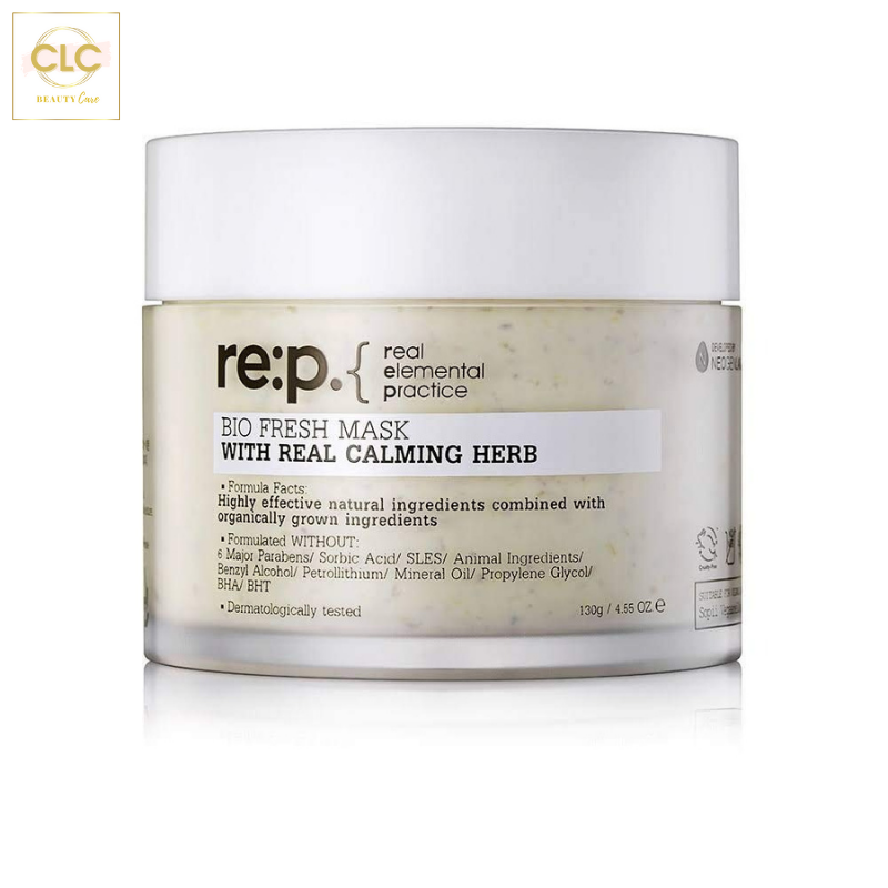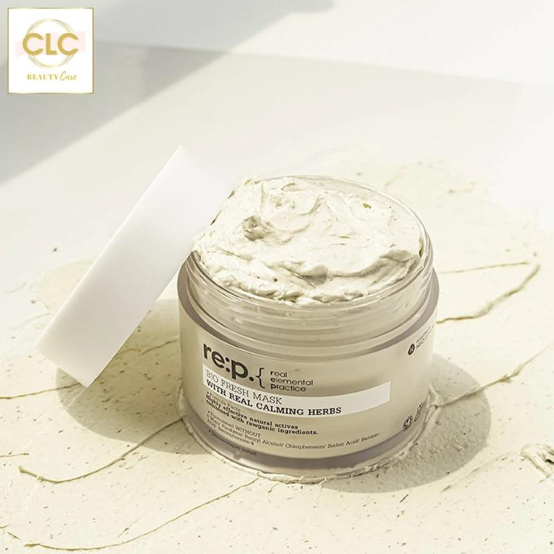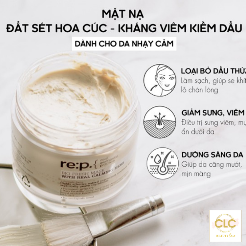 ❇ Mặt nạ Re:p Bio Fresh Mask With Real Calming Herbs với thành phần chính chứa đất sét trắng vùng núi lửa Hawaii, giàu khoáng chất và nhuyễn mịn, không khô giúp làm sạch da sâu hơn vào bên trong và se khít lỗ chân lông hiệu quả, bằng cách hấp thụ chất thải, bã nhờn sâu trong lỗ chân lông, thanh lọc làn da xỉn màu đồng thời cung cấp dưỡng chất cho làn da mệt mỏi, giảm thiểu dấu hiệu lão hóa, giúp da tươi sáng hơn.